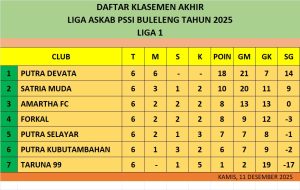 Dengan hasil pertandingan ini, maka klasemen akhir Liga I yakni Putra Devata sebagai juara dengan 18 poin. Satria Muda Pengulon di posisi dua dengan sepuluh poin. Amartha FC di posisi tiga dengan delapan poin. Forkal di posisi empat dengan delapan poin. Putra Selayar di posisi lima dengan tujuh poin. Putra Kubutambahan di posisi enam dengan enam poin. Taruna 99 sebagai juru kunci dengan satu poin.