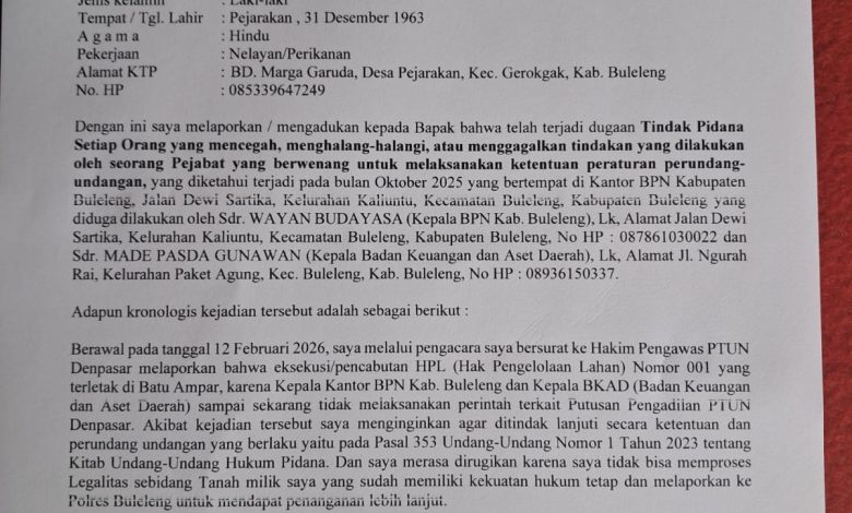 Bagaimana kronologisnya? Rahnawi dalam laporannya menceritakan, “Bahwa pada tanggal 12 Februari 2026, saya melalui pengacara saya bersurat ke Hakim Pengawas PTUN Denpasar melaporkan bahwa eksekusi/pencabutan HPL (Hak Pengelolaan Lahan) Nomor 001 yang terletak di Batu Ampar, karena Kepala BPN Kabupaten Buleleng dan kepala BKAD sampai sekarang tidak melaksanakan perintah terkait Putusan Pengadilan PTUN Denpasar.”
